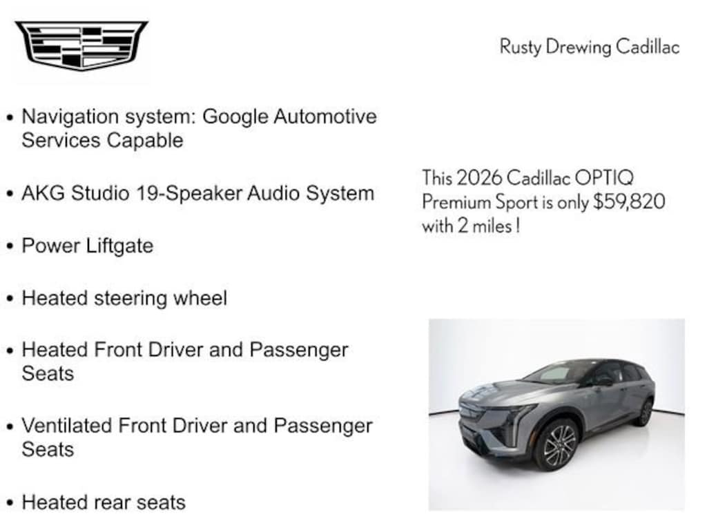 Silver Metallic 2026 Cadillac OPTIQ Premium Sport AWD 1-Speed Automatic Electric Motor OPTIQ Premium Sport, 4D Sport Utility, Electric Motor, 1-Speed Automatic, AWD, Silver Metallic, Noir Inteluxe Seats With, AKG Studio 19-Speaker Audio System, Heated Front Driver and Passenger Seats, Heated rear seats, Heated steering wheel, Navigation system: Google Automotive Services Capable, Power Liftgate, Ventilated Front Driver and Passenger Seats.