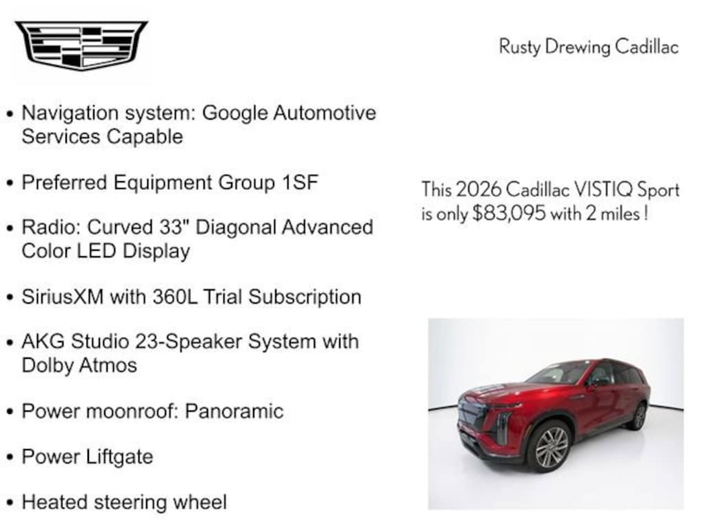 Radiant Red 2026 Cadillac VISTIQ Sport AWD 1-Speed Automatic Electric Motor VISTIQ Sport, 4D Sport Utility, Electric Motor, 1-Speed Automatic, AWD, Radiant Red, Sheer Gray Premium Synthetic, AKG Studio 23-Speaker System with Dolby Atmos, Heated Front Driver and Passenger Seats, Heated rear seats, Heated steering wheel, Navigation system: Google Automotive Services Capable, Power Liftgate, Power moonroof: Panoramic, Preferred Equipment Group 1SF, Radio: Curved 33 Diagonal Advanced Color LED Display, SiriusXM with 360L Trial Subscription, Ventilated Front Driver and Passenger Seats.